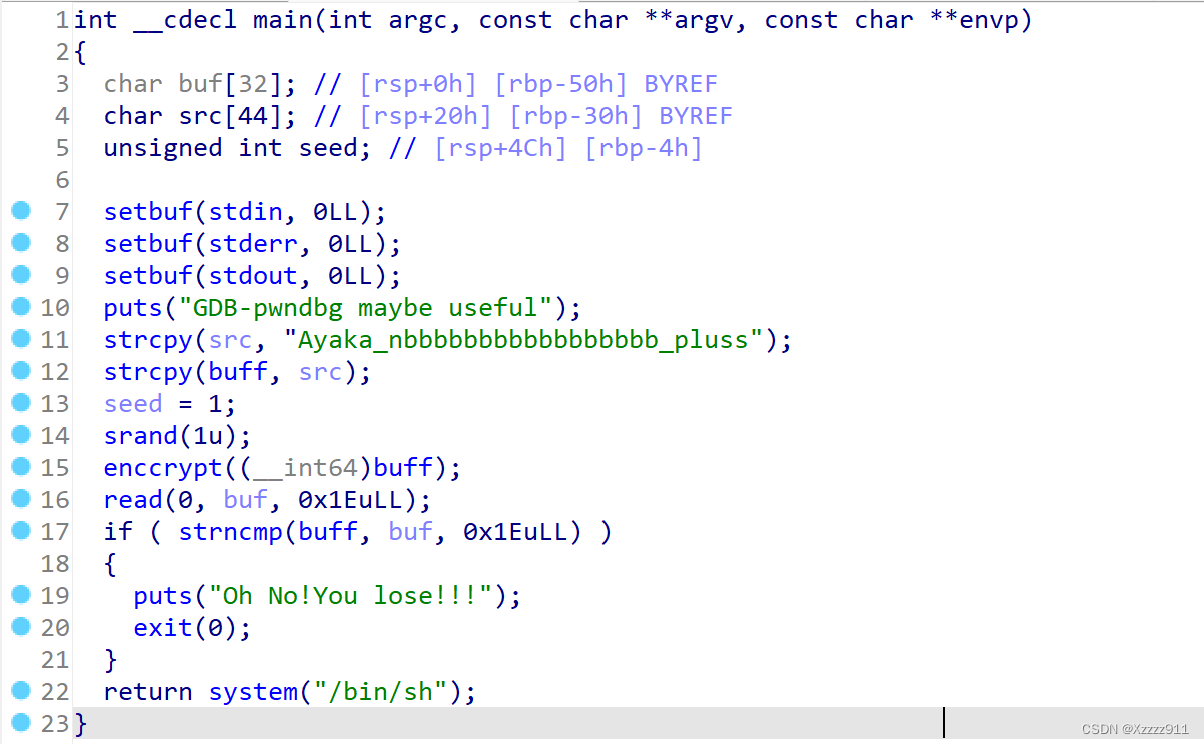 分析一下代码,发现 buff 被加密了,只需绕过这个 if 语句,就可以执行 binsh 了,问题是怎么绕过呢?gdb 调试来告诉你。