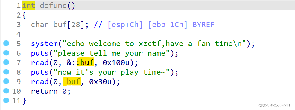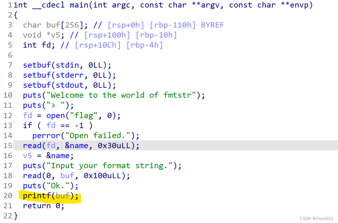 首先分析一下代码,可知出现了两个 buf,但是这两个 buf 的作用是不同的。第一个 buf 在 .bss 段,这样就可以把 /bin/sh 写进 buf 里面,然后执行 system("/bin/sh") 获得 flag。