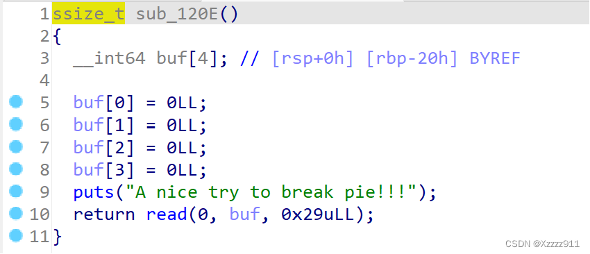 IDA 反编译,存在栈溢出,并且有后门函数(因为开启了 PIE,地址的后三位不会变 26c,所以只需爆破倒数第四位)。由于小端序的原因,所以就是 \x6c\x11,后面 \x11 是随机的,可以改成别的,如下都行: