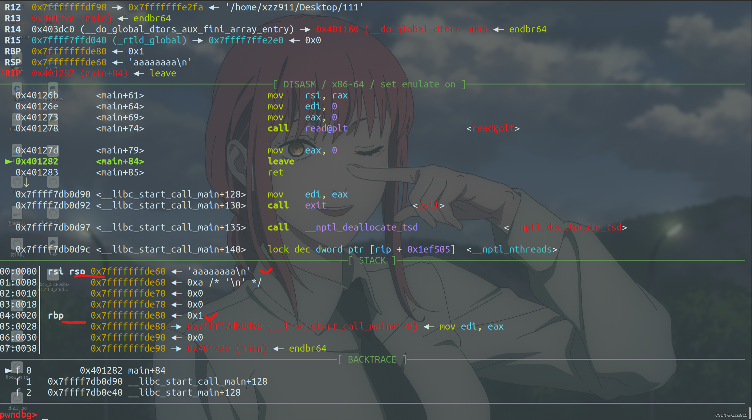 最后再查看一下需要溢出多少字节的垃圾数据(一般情况下需要溢出的垃圾数据可以在 IDA 里面找到),gdb 调试一下,0x80 - 0x60 = 0x20