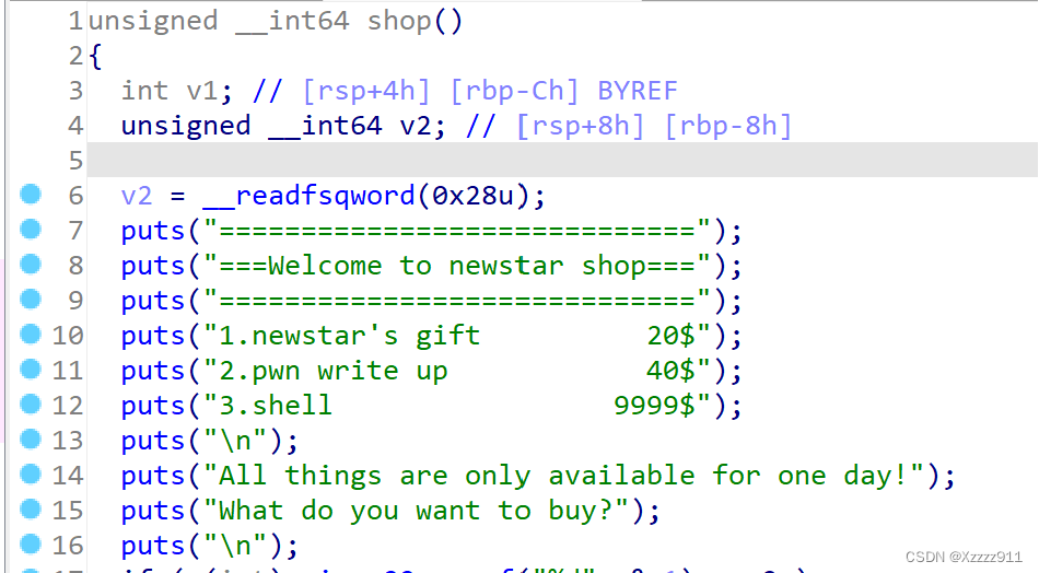 先看下 shop(),很明显自己的目的就是使直接赚够钱可以买到 shell,从而达到 cat flag 的目的