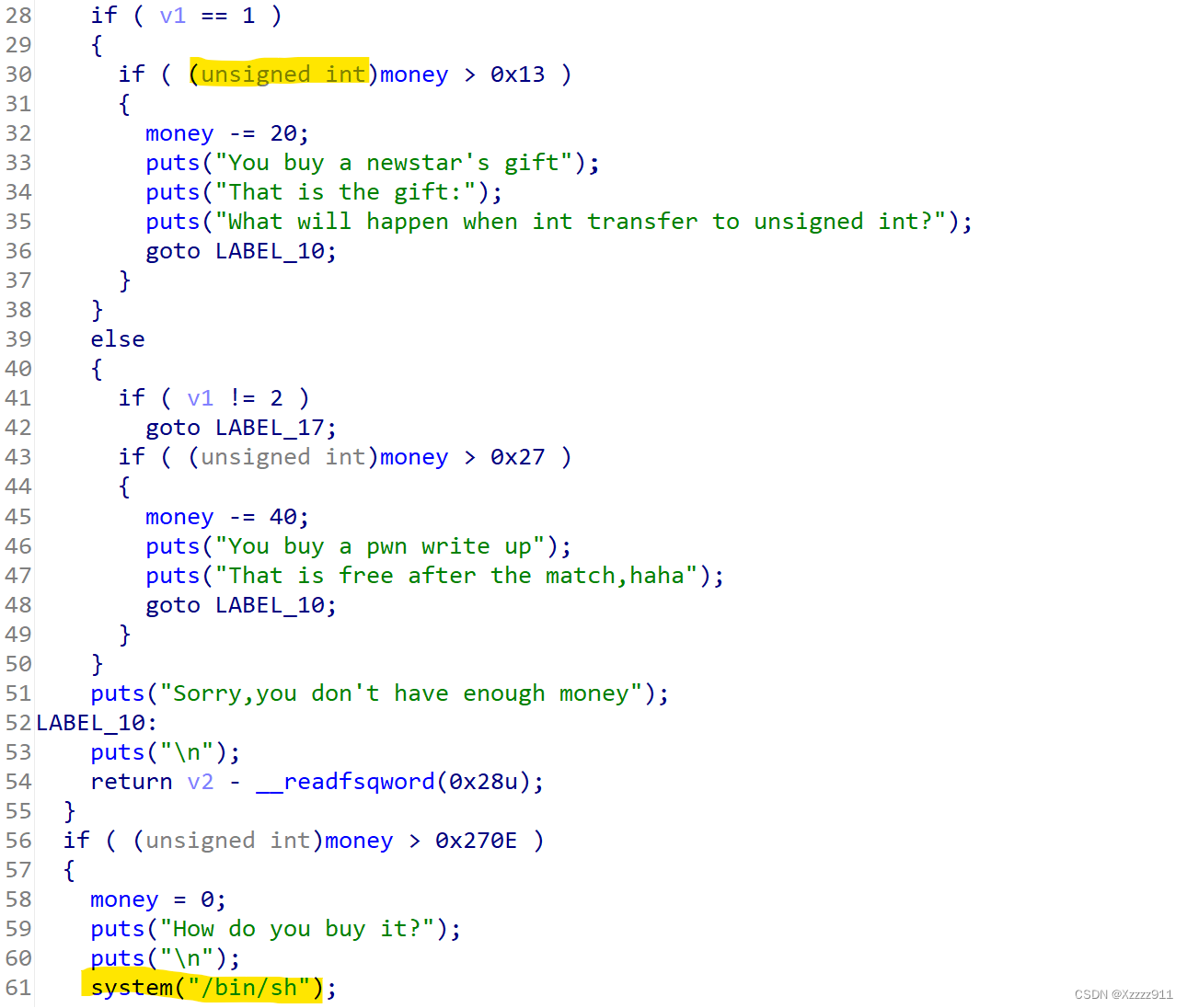 这道题就是一道整形溢出,需要认真的代码审计,当时做的的时候有点傻逼,脑子没有转过来一直在想 dont_try 一次只能一次扣 50,这样不可能使 money 达不到负数,忘记可以买东西了我真啥