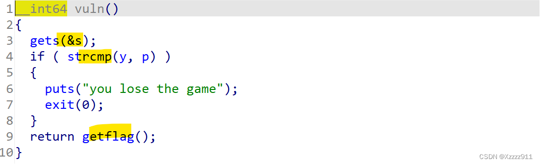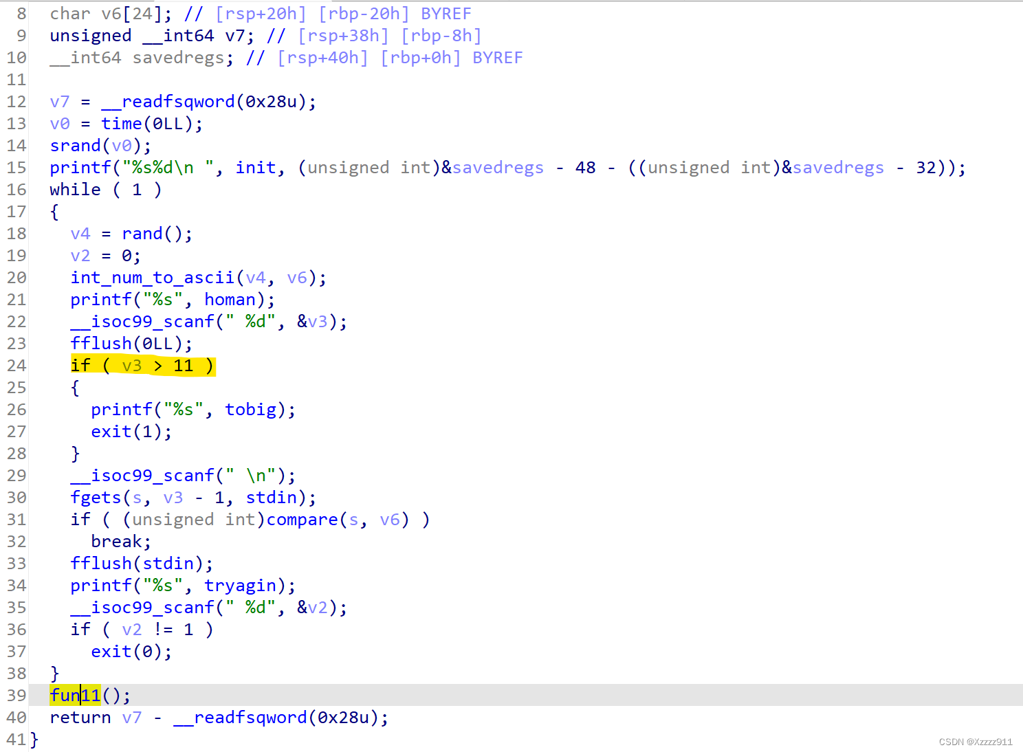 ida反汇编,代码审计发现有个后门函数 fun11 ,想办法调用后门函数,首先先得绕过 if 函数,输入小于等于11的就行,然后就是想办法跳出while循环,这就需要看 compare 函数,若s与v6相等,则跳出循环,然后就要看到int_num_to_ascii 函数(该函数主要功能是将一个整数转换为ASCII字符数组)将一个随机数转化为ascll码值赋值给v6,并且s是用户输入的值,就可以输入随机数让其等于v6,这样就可以获得shell了,直接干就完事了