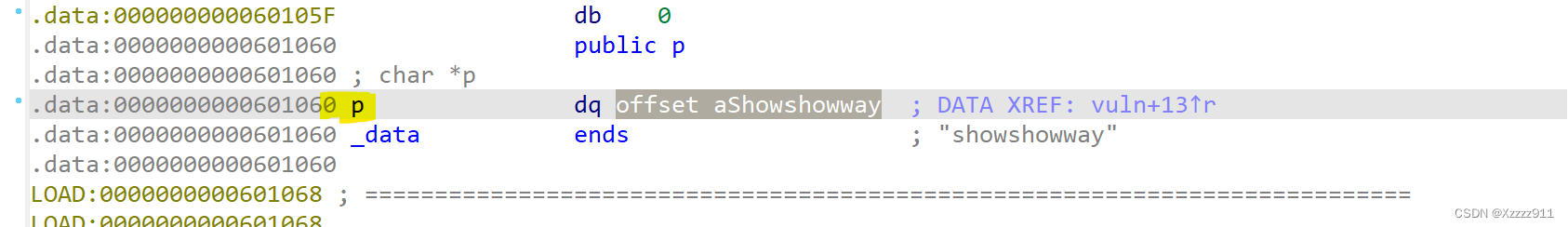 ida反汇编一下,代码审计你会发现gets函数造成了溢出,并且需要让 y 等于 p,就可以直接绕过if1语句,执行后门函数,接下来就是该怎么构造payload(s与y相距了0x40个字节,意思就是输入0x40个字节的数据就可以覆盖到 y ,然后再修改其内容,使其与p相等就可以了)这里需要认真思考,记录一下
