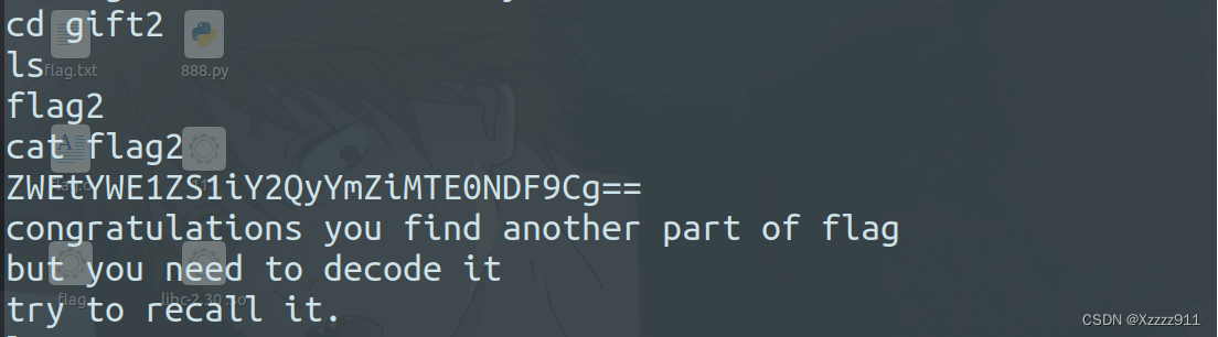 签到题,考察隐藏文件的查询(ls -a),然后就是 base64 解码: