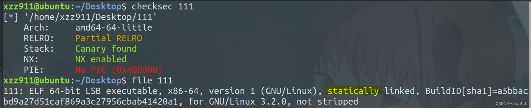 查看一下保护机制,64位打开了canary和NX,然后还是个静态链接的程序
