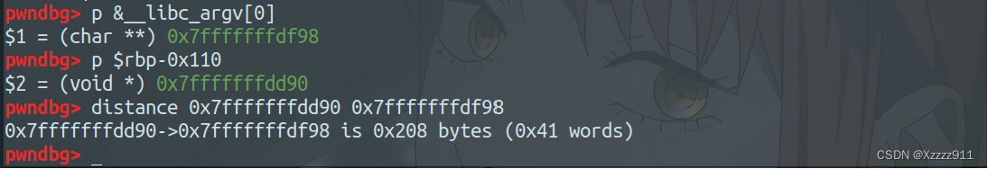 两个地址相减就可得偏移 0x208(但是正确的偏移是 0x1f8,比正确的偏移多了 0x10,问了下学长可能是版本的问题,方法会了就行,小问题不伤大雅)